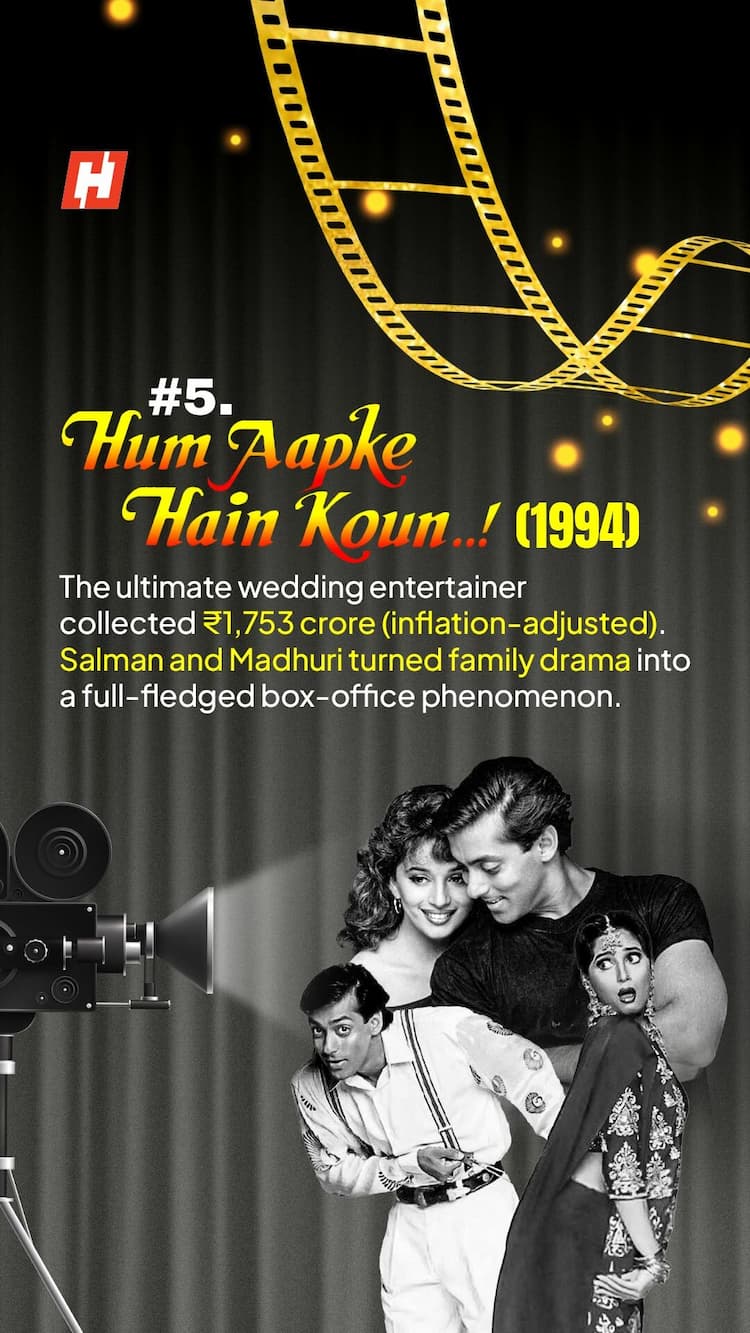Hum Aapke Hain Koun..! (1994) is still a marvel. This Bollywood film hit the jackpot after the liberalisation era and can be regarded as the biggest Bollywood film of all time. It was a cultural marathon and changed the whole Indian wedding and family film scene. With the direction of Sooraj Barjatya and the playing of Salman Khan alongside Madhuri Dixit, it became the very first Hindi film to cross the ₹100 crore mark, today equivalent to ₹1,753 crore.