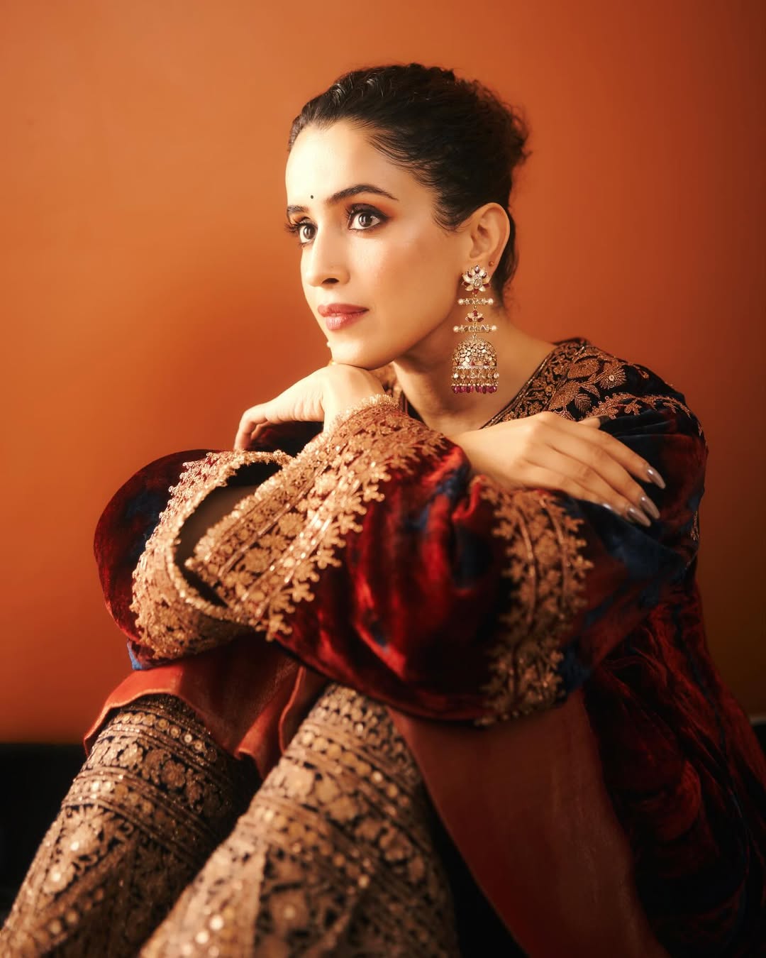 In her latest festive outing, Sanya Malhotra chose to wear a wine hued velvet Dil-Daar Choga set from the house of designer Heena Kochhar, the price of which could be around ₹80,000. The deep wine hue and the tilla embroidery work exuded traditional charm with a touch of modern minimalism. To add a hint of glitz, she carried a handcrafted, embellished clutch by Meera Mahadevia, valued at approximately ₹20,000. Sanya completed her ethnic look with a sleek bun, a small bindi, complemented by statement dangling jhumkas from Kalajee Jewellery, worth a whopping ₹6,45,000. Her soft and subtle makeup added the perfect touch of elegance to her look.