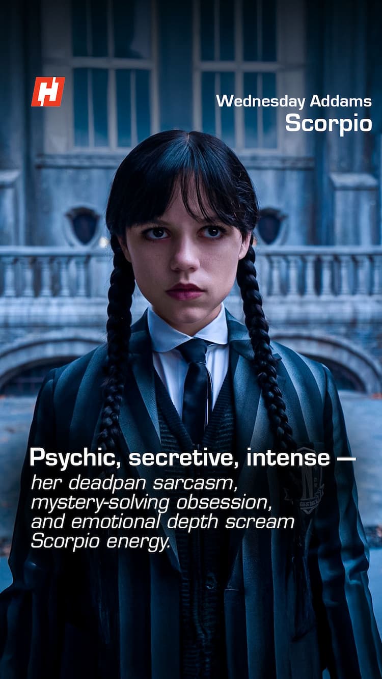 Wednesday Addams is a classic Scorpion. She’s dark, mysterious, and deeply intense. Obsessed with the macabre, loyal but guarded, and fearless in uncovering secrets. Her detective streak and need for control scream fixed water energy.