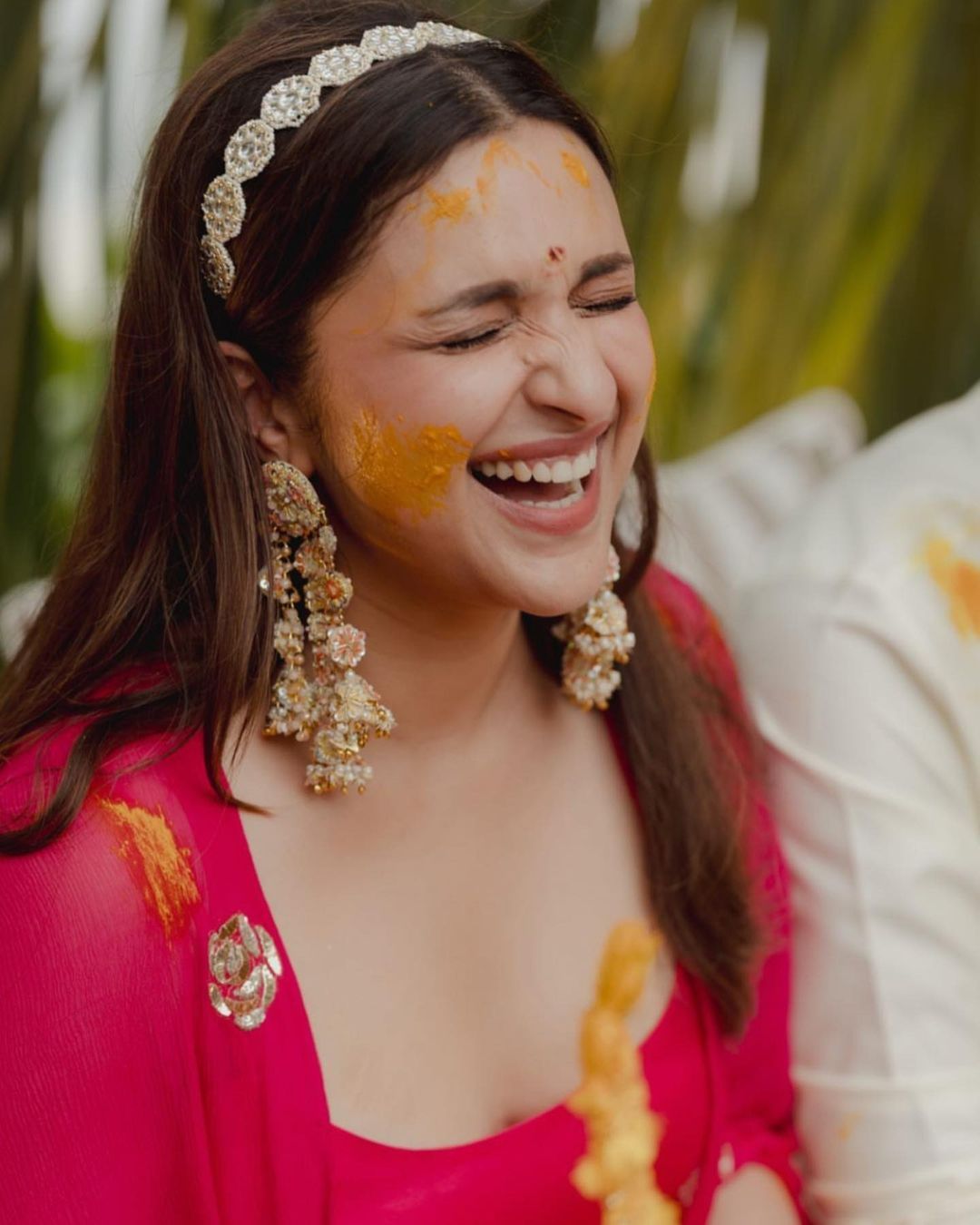 A lovely choice for brides who want to maintain tradition with a hint of personality, Parineeti's look reminds us that pinks can work for haldi too!