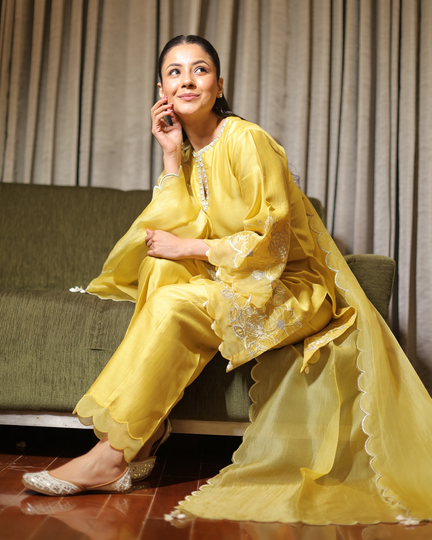 Festive dressing is not always heavy fabric and layers. Shehnaaz knows how to go breezy, and exude comfort in a lightweight and flowy suits that are perfect for festivity or a day event or brunch.